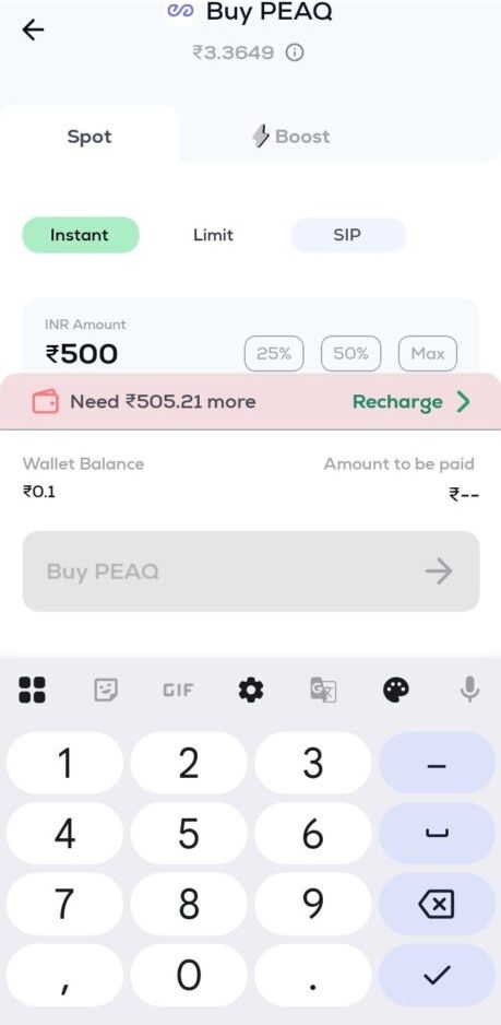 जिस भी coin को buy करना है उसको सर्च करो। Buy वाले ऑप्शन पर क्लिक करके अमाउंट डालो